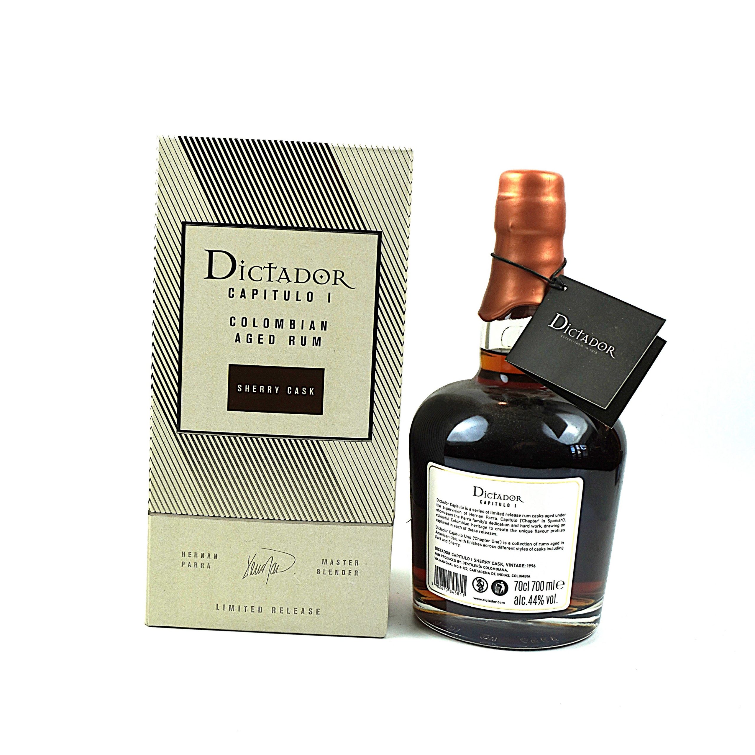 Der Dictador CAPITULO I 1996/2020 ist ein limitierter kolumbianischer Rum, der 24 Jahre in Sherryfässern reifte. Er besticht durch eine komplexe Aromenvielfalt und eine elegante Balance zwischen süßen und würzigen Noten. In der Nase dominieren trockene Sherry-Noten, Vanille, Eiche und ein Hauch von Leder, während der Gaumen mit süßem Sherry, roten Früchten, Zimt, Ingwer und einer erdigen Trockenheit von Eichenholz verwöhnt wird. Im Finish bleiben süße Leder- und Tabaknoten zurück. Der Rum hat einen Alkoholgehalt von 44 % und ist auf 900 Flaschen limitiert.