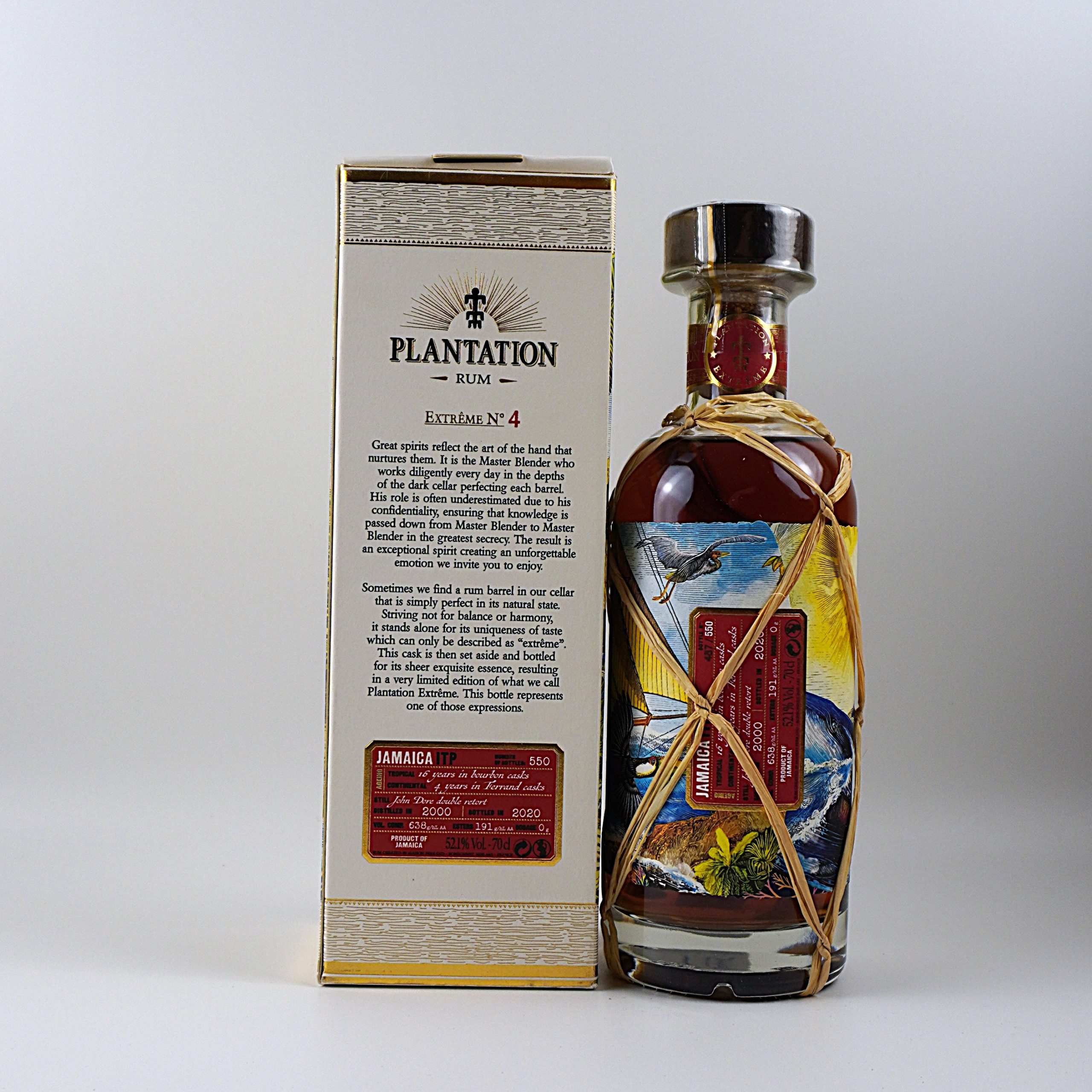 Dieser Rum, Teil der „Extreme“-Serie von Plantation, wurde im Jahr 2000 in der Long Pond Destillerie mit einer John Dore Pot Still destilliert. Er reifte 16 Jahre lang in Bourbonfässern in Jamaika und anschließend vier weitere Jahre in ehemaligen Cognac-Fässern von Ferrand in Frankreich. Dies ist die vierte Veröffentlichung der Extreme-Serie, die für ihre unverfälschten, zusatzfreien Rums bekannt ist.