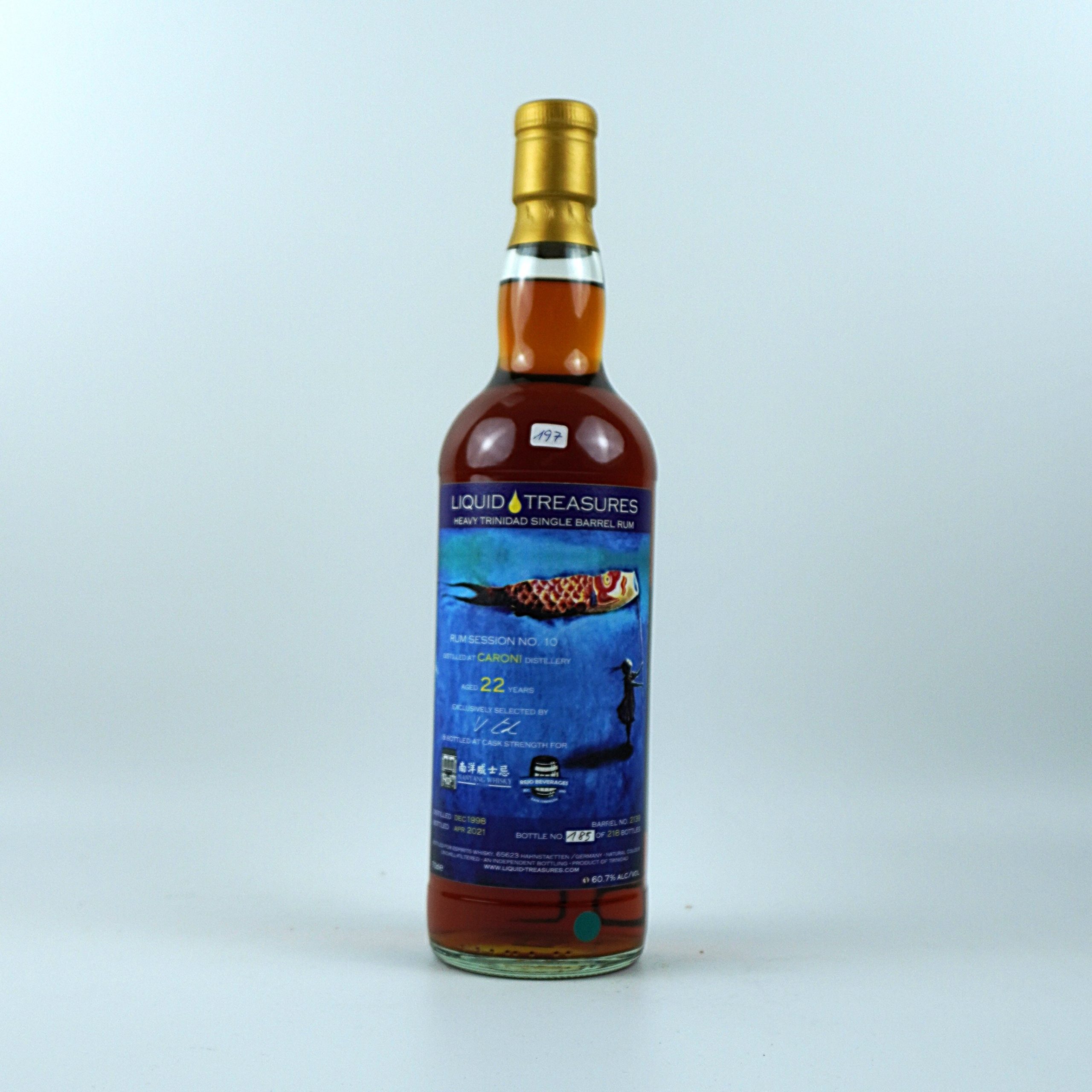 Der Liquid Treasures Caroni Rum Session No. 10 ist ein herausragendes Beispiel für die legendären Rums der 2002 geschlossenen Caroni-Destillerie in Trinidad. Dieser Rum wurde 1998 aus Melasse destilliert und reifte 22 Jahre lang in Fassstärke mit einem Alkoholgehalt von 60,7%. Die limitierte Abfüllung umfasst nur 218 Flaschen.