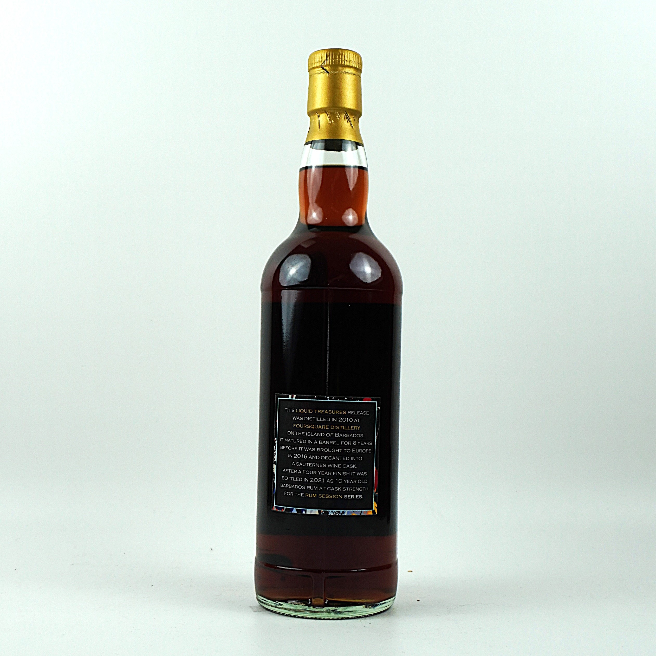 Der Liquid Treasures Foursquare Rum Session No. 9 ist eine limitierte Abfüllung der renommierten Foursquare Distillery aus Barbados. Dieser Rum wurde 2010 aus Melasse destilliert und nach einer tropischen Reifung von sechs Jahren in tropischen Klimazonen für weitere vier Jahre in ehemaligen Sauternes-Weinfässern gelagert. Im Jahr 2021 wurde er mit einem Alkoholgehalt von 52,8 % Vol. abgefüllt.